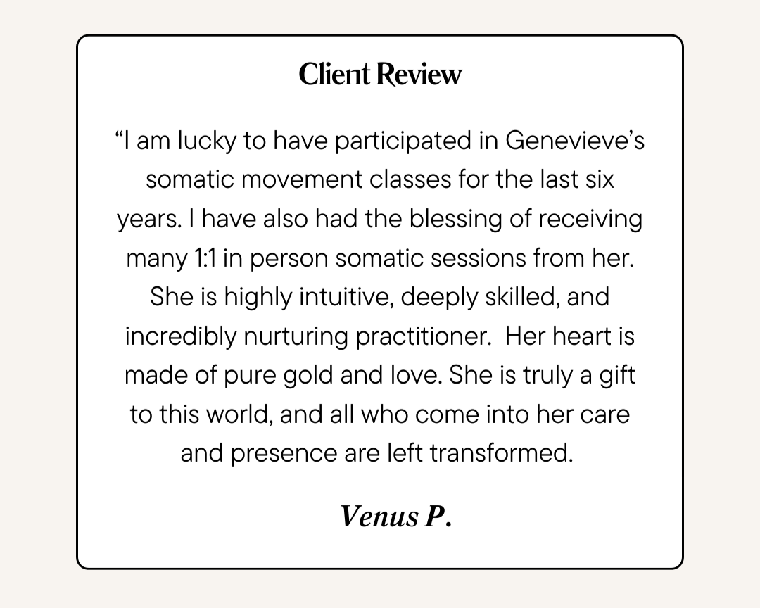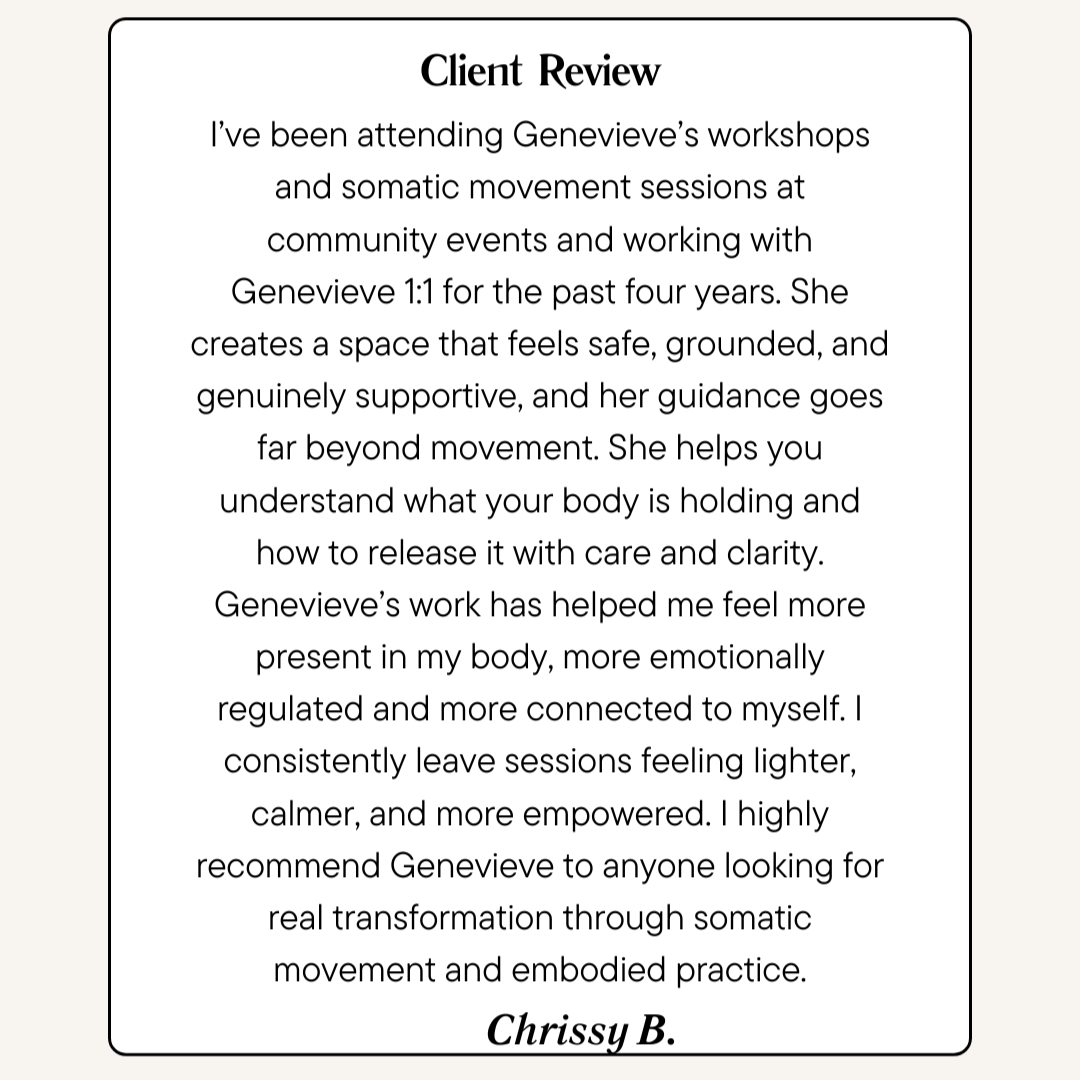 Hi, I’m Genevieve. I’m an integrative somatic practitioner with over 6 years of experience supporting individuals of all ages and abilities in reconnecting with their bodies, nervous systems, and inner sense of safety.