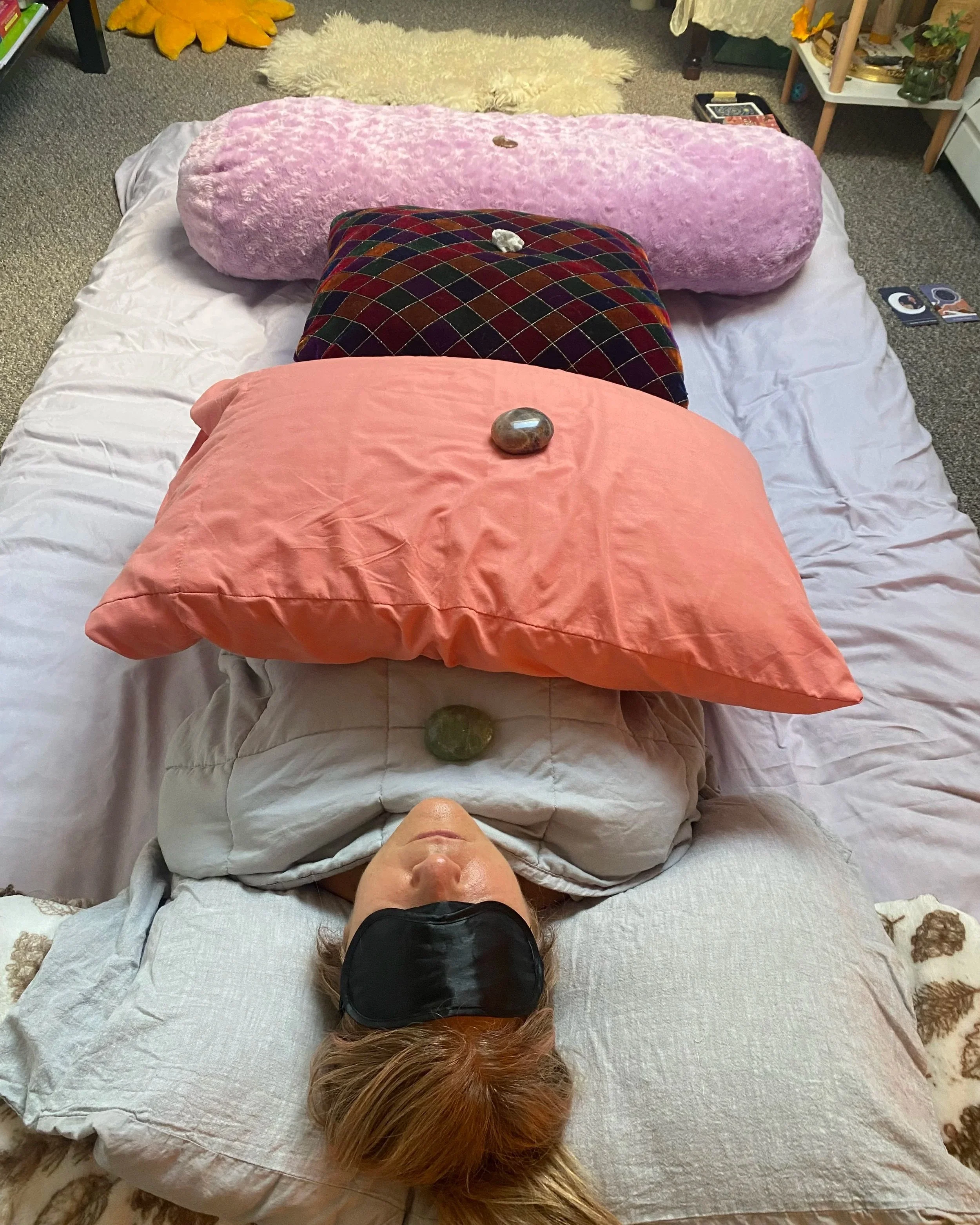 In these sessions, a weighted blanket and eye mask are used to create a cocooning experience that encourages the body to settle into a state of rest and restoration. The consistent, evenly distributed pressure signals safety to the nervous system, helping to reduce hyperarousal and support a deeper sense of calm.